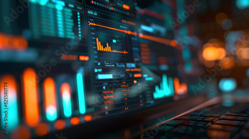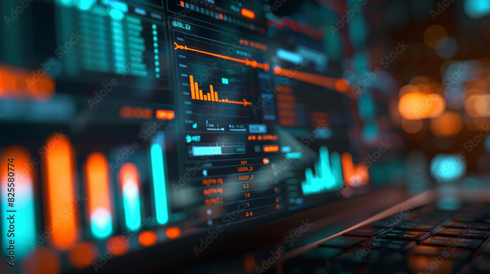 Wall mural a close-up view of a computer screen displaying financial data with graphs and analytics in a dark r - Wall murals Wall mural a close-up view of a computer screen displaying financial data with graphs and analytics in a dark r - Wall murals