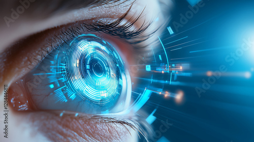 Wall mural : A close-up view of a human eye integrated with digital technology, showcasing glowing data patterns