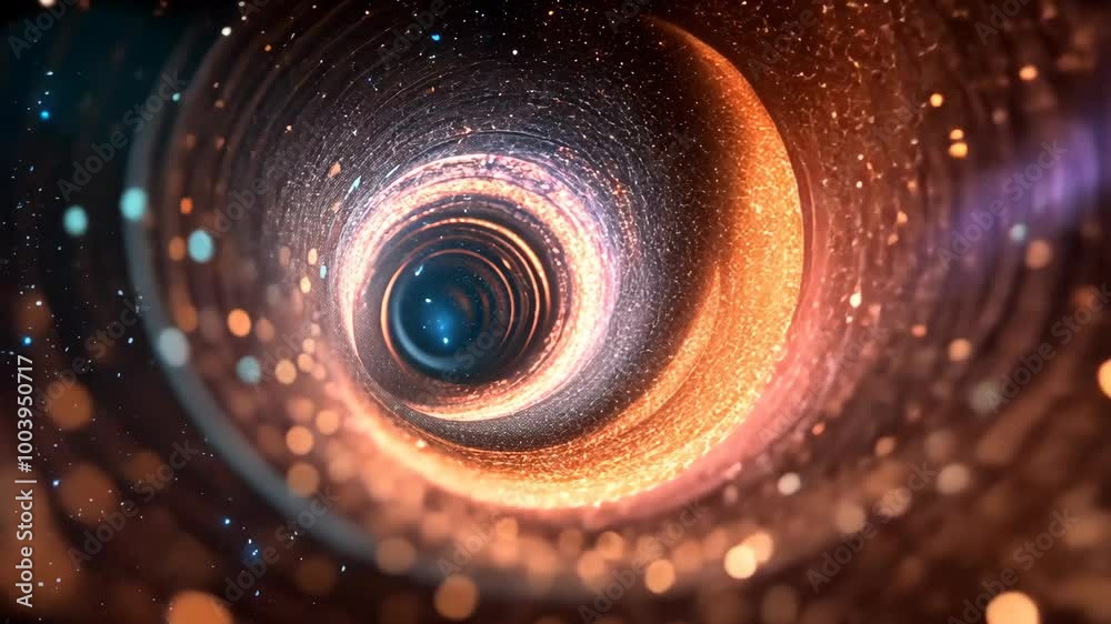 A close-up view of a spiraling tunnel of light with shimmering particles and a blue glow at its centWall mural