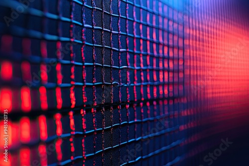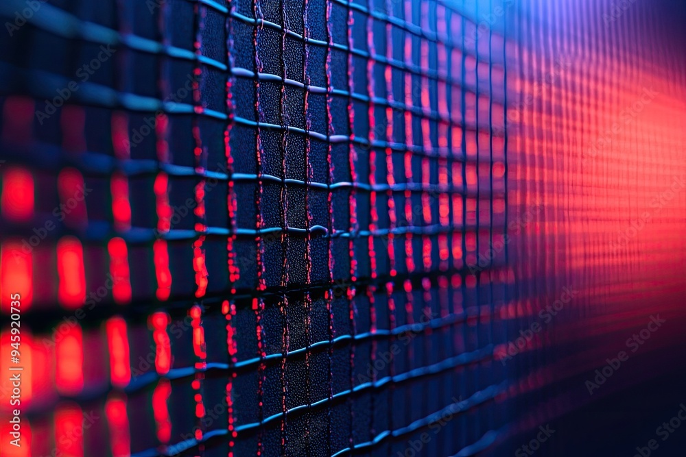 Wall mural : A close-up view of a textured surface illuminated by vibrant red and blue lights, creating an abstra