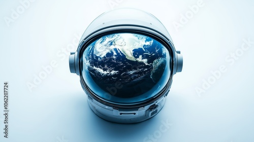 Wall mural a close-up view of an astronaut helmet reflecting earth, with a minimalistic background emphasizing