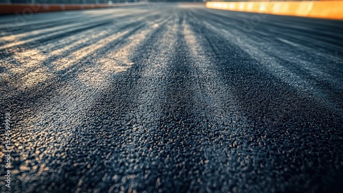The watermark will not be included on Wall mural.: A close-up view of an empty f1 track showcasing the textured asphalt and reflections in the sunlight