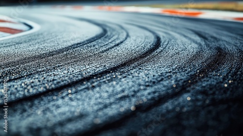 The watermark will not be included on Wall mural.: A close-up view of an empty formula 1 track showcasing the smooth asphalt surface and intricate tire