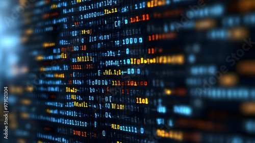 The watermark will not be included on Wall mural.: A close-up view of binary code on a computer screen with blue and orange highlights