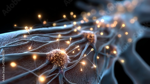 Wall mural a close-up view of neurons in the brain, showcasing the intricate web of connections and glowing syn - Wall murals Wall mural a close-up view of neurons in the brain, showcasing the intricate web of connections and glowing syn - Wall murals