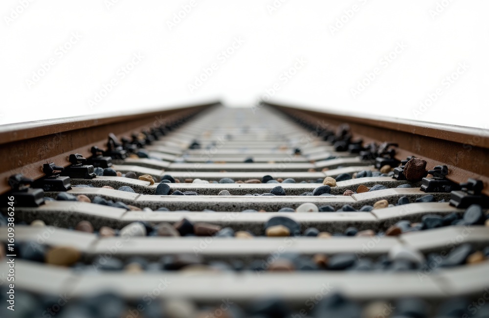 The watermark will not be included on Wall mural.: A close-up view of railway tracks extending into the distance with a white sky background