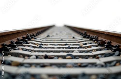 Wall mural a close-up view of railway tracks extending into the distance with a white sky background