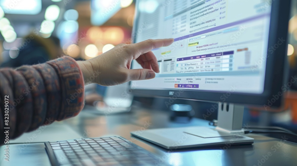 Wall mural a closeup of a hand submitting a form on a computer screen the background is an office desk, highlig - Wall murals Wall mural a closeup of a hand submitting a form on a computer screen the background is an office desk, highlig - Wall murals