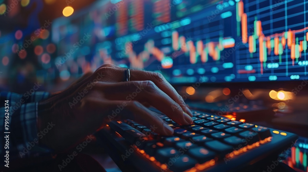 Wall mural : A closeup of hands typing on a keyboard with stock market charts and graphs in the background, worki