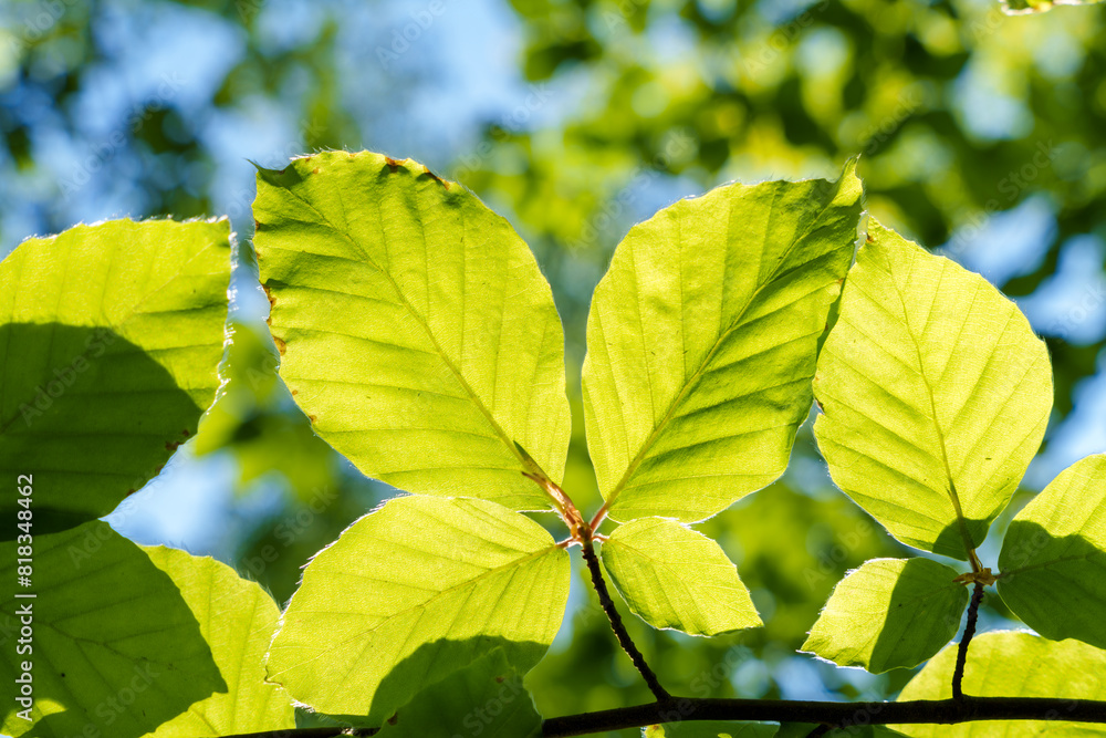 Wall mural a closeup view of a green leaf on a tree branch in sunlight - Wall murals Wall mural a closeup view of a green leaf on a tree branch in sunlight - Wall murals