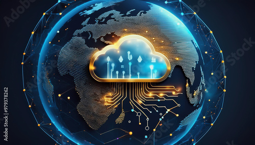 Wall mural : A cloud computing concept with a golden cloud symbol connected to a global network of interconnected
