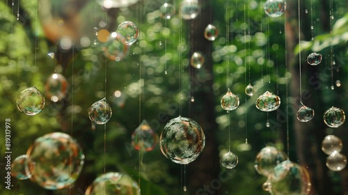 The watermark will not be included on Wall mural.: A cluster of floating orbs dangling from a twine in front of verdant foliage