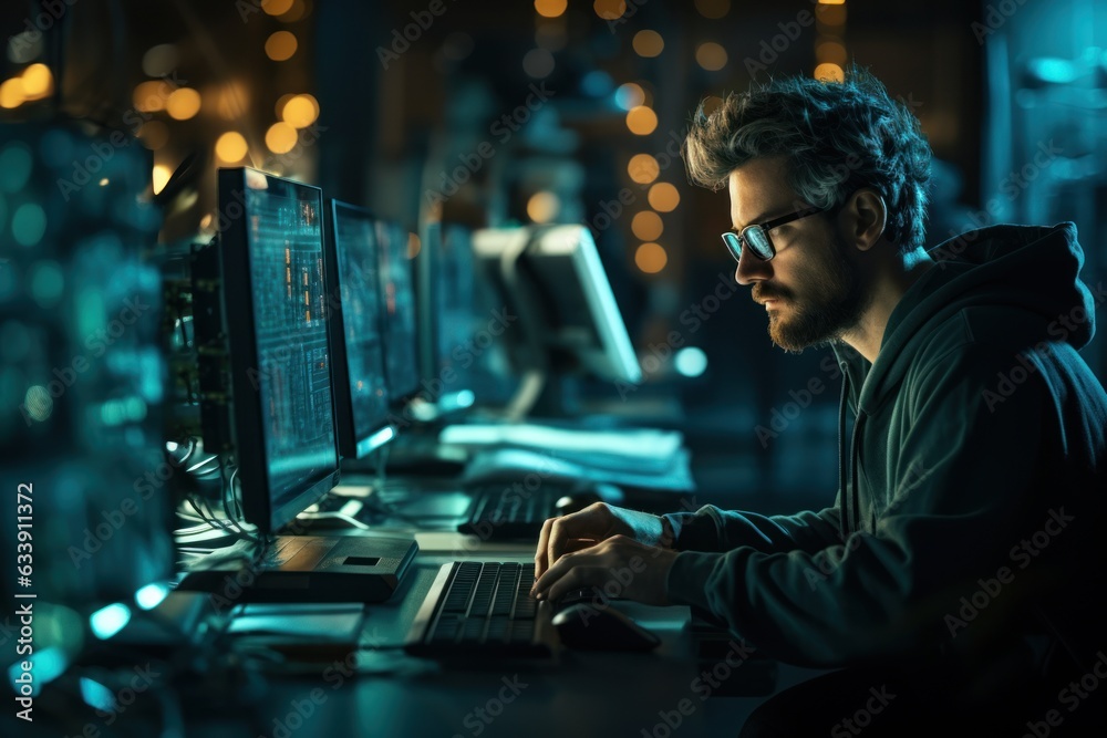 Wall mural a coder, a developer-oriented in glasses working on a computer to view programming code information. - Wall murals Wall mural a coder, a developer-oriented in glasses working on a computer to view programming code information. - Wall murals
