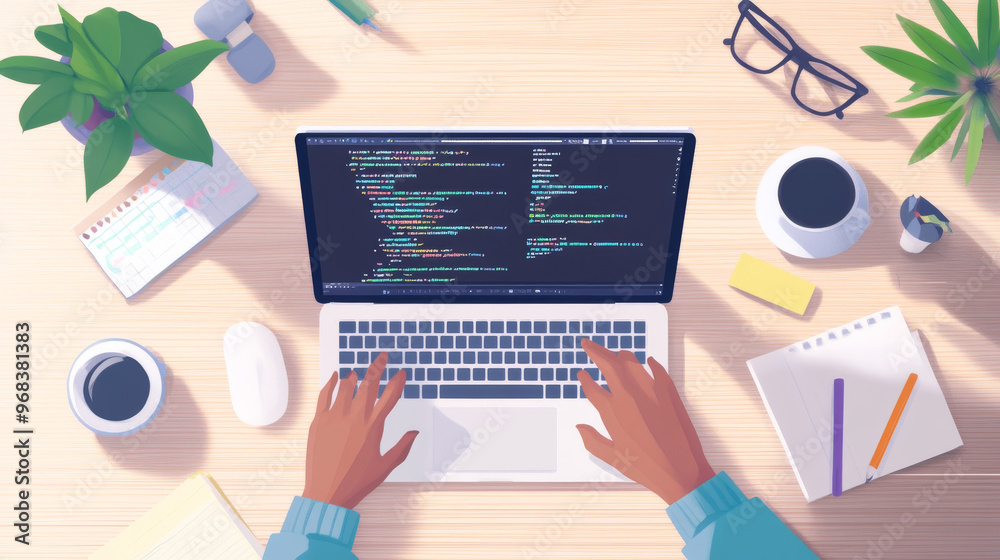 Wall mural : A coder is focused on programming with html5 canvas, surrounded by plants, coffee, and stationery, c