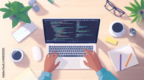Wall mural a coder is focused on programming with html5 canvas, surrounded by plants, coffee, and stationery, c
