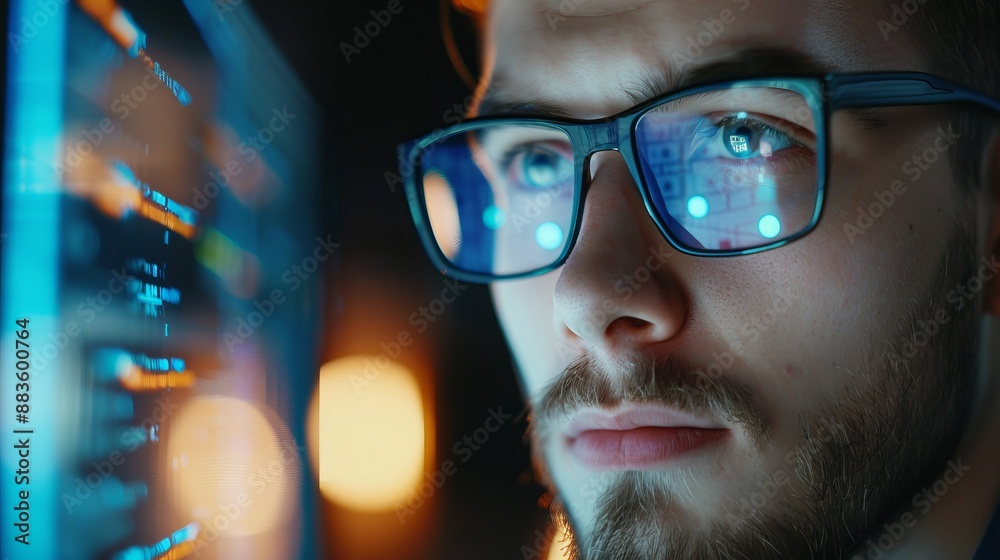 Wall mural a coder working diligently on a complex system of multiple screens in a low light atmosphere. the am - Wall murals Wall mural a coder working diligently on a complex system of multiple screens in a low light atmosphere. the am - Wall murals