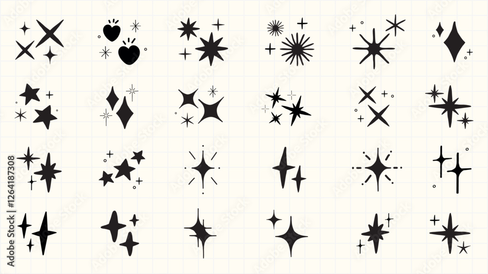 Wall mural a collection of black star and sparkle icons in various shapes and sizes on a grid background. inclu - Wall murals Wall mural a collection of black star and sparkle icons in various shapes and sizes on a grid background. inclu - Wall murals