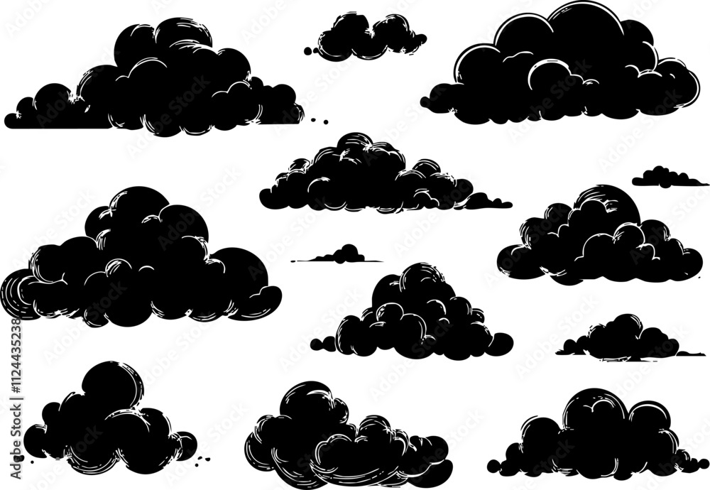 A collection of various black clouds in different shapes and sizes, suitable for graphic design and Wall mural