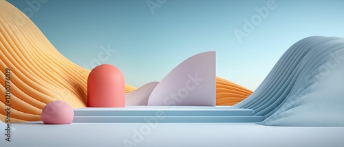 The watermark will not be included on Wall mural.: A colorful abstract landscape featuring smooth curves and geometric shapes against a gradient sky -