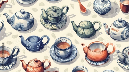 The watermark will not be included on Wall mural.: A colorful array of illustrated teapots and cups in various patterns and designs