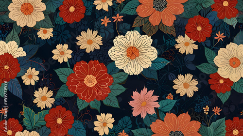 Wall mural : A colorful background with flowers and traditional japanese patterns generative ai