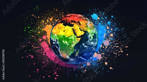 The watermark will not be included on Wall mural.: A colorful earth with splashes of paint, representing global environmental symbols and colors on bla
