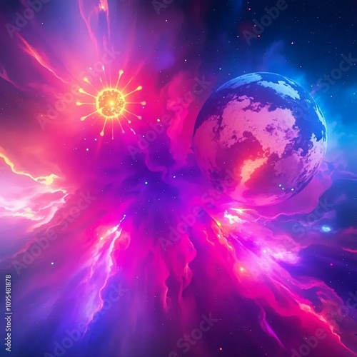 The watermark will not be included on Wall mural.: A colorful space scene with a large planet and a small sun