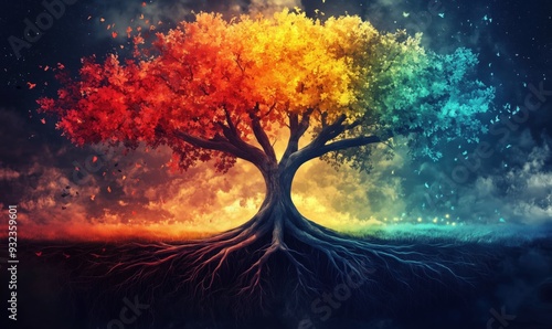 Wall mural a colorful tree with roots that are also colorful. the tree is surrounded by a blue sky and a cloudy - Wall murals Wall mural a colorful tree with roots that are also colorful. the tree is surrounded by a blue sky and a cloudy - Wall murals