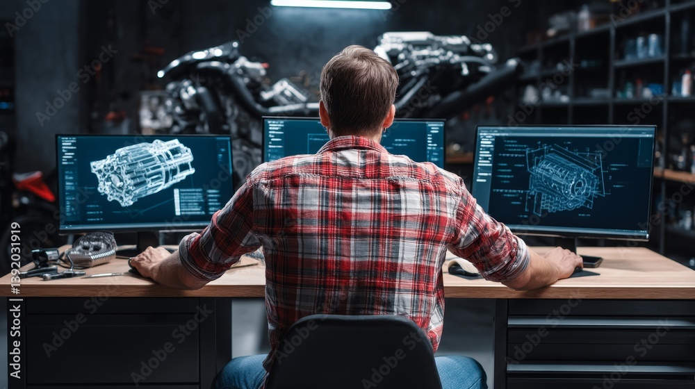Wall mural a components manufacturing factory is visible through the office window as an engineer/technician wo