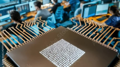 The watermark will not be included on Wall mural.: A computer chip with glowing circuitry, overlaid on a classroom with students working on computers