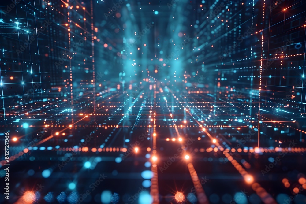 Wall mural a computer generated image of a futuristic cityscape with a blue sky and orange and blue lights. the - Wall murals Wall mural a computer generated image of a futuristic cityscape with a blue sky and orange and blue lights. the - Wall murals