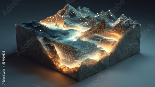The watermark will not be included on Wall mural.: A computer generated image of a mountain range with a blue sky and a yellowish glow - the mountains a