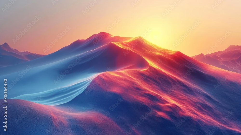 The watermark will not be included on Wall mural.: A computer generated image of a mountain range with the sun in the distance and clouds in the foregr