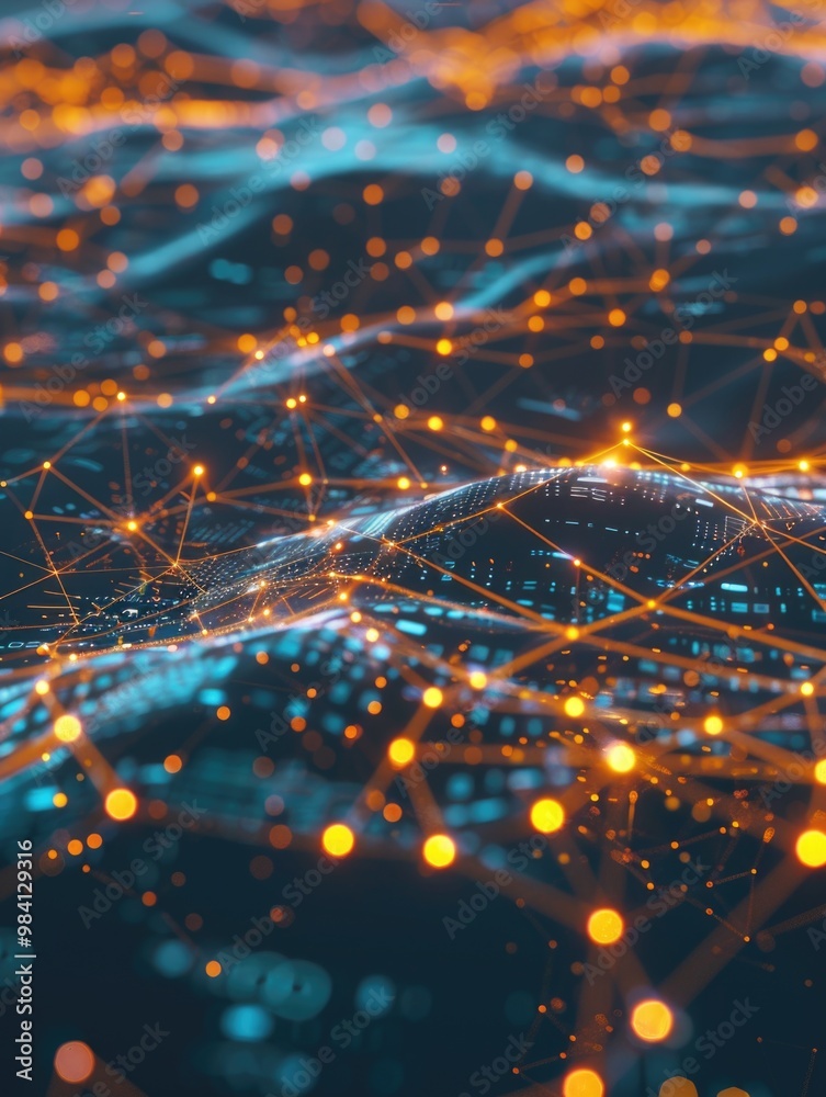 The watermark will not be included on Wall mural.: A computer generated image of a wave with a network of orange dots - the image has a futuristic and t