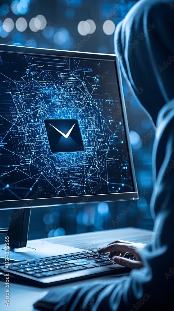 Wall mural a computer monitor displaying a phishing email, with a hooded figure faintly visible in the backgrou - Wall murals Wall mural a computer monitor displaying a phishing email, with a hooded figure faintly visible in the backgrou - Wall murals