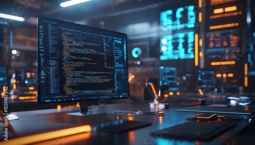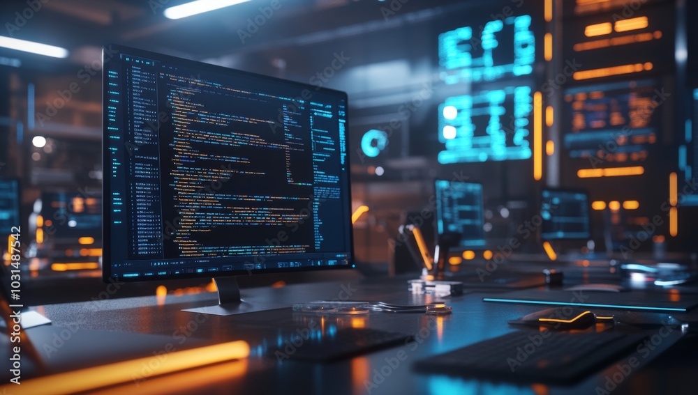 Wall mural : A computer monitor displaying code in a futuristic office setting -
