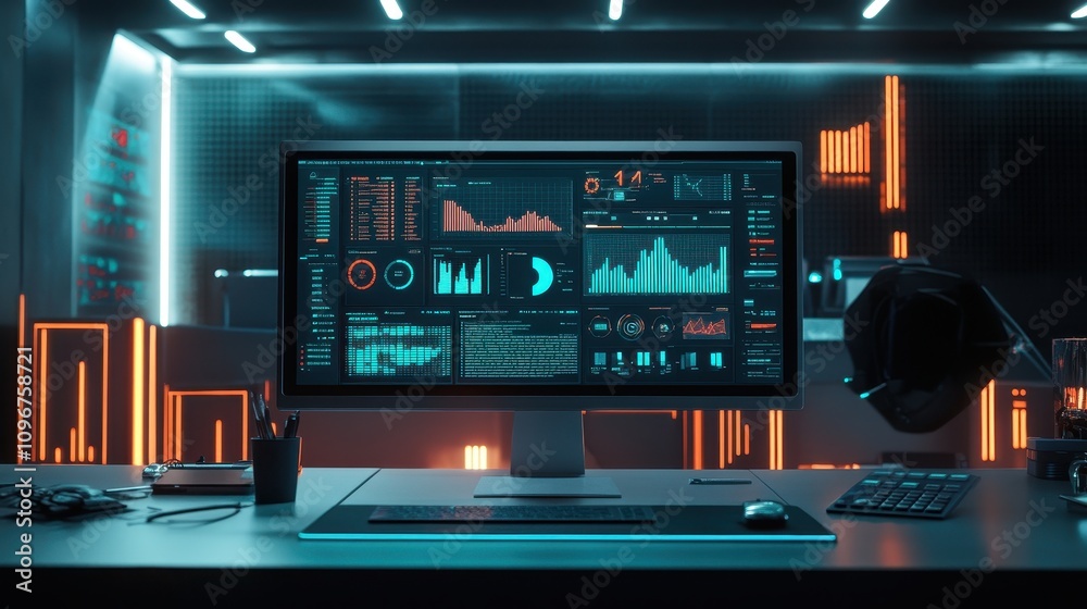 The watermark will not be included on Wall mural.: A computer monitor displays a number of graphs and charts