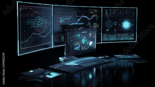 Wall mural a computer room with multiple monitors and a display of data. ai - Wall murals Wall mural a computer room with multiple monitors and a display of data. ai - Wall murals