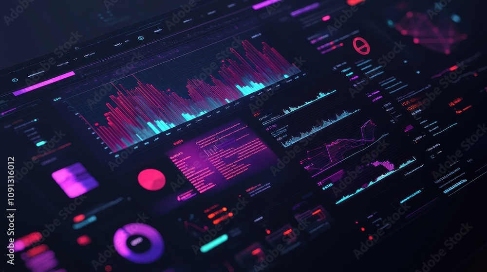 Wall mural : A computer screen with a lot of red and purple lines and numbers
