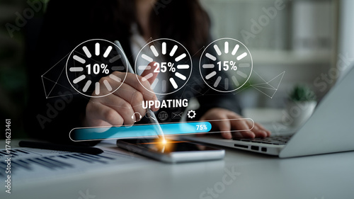 The watermark will not be included on Wall mural.: A concept of a system update and software installation - a progress bar and loading icons showing the
