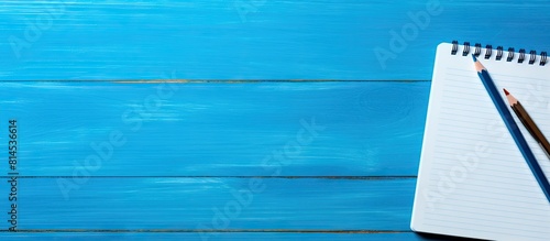 A copy space image showing a pen placed on a blue notepad which is sitting on a tableWall mural
