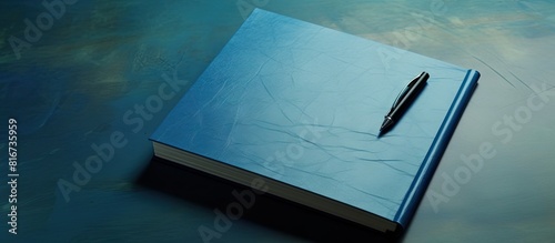 The watermark will not be included on Wall mural.: A copy space image showing a pen placed on a blue notepad which is sitting on a table