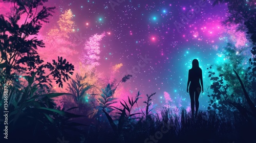 The watermark will not be included on Wall mural.: A cosmic neon background with glowing tendrils and botanical elements blending with scattered star-l