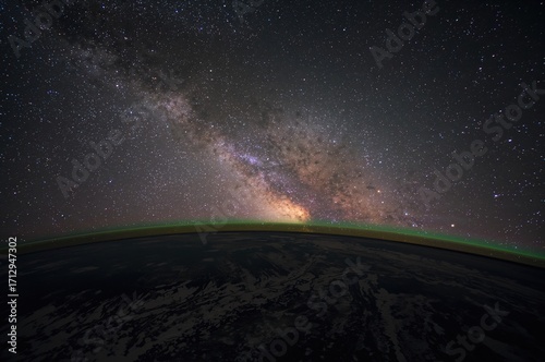 Wall mural : A cosmic view capturing the milky way along with earth's atmosphere and auroras, created using eleme