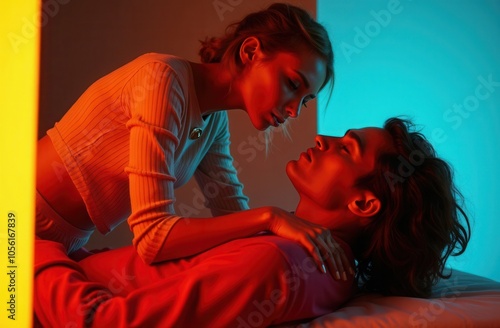 The watermark will not be included on Wall mural.: A couple sharing an intimate moment in a softly lit room with colorful lighting during a quiet eveni