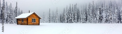 Wall mural a cozy wooden cabin stands in a snow-covered landscape, surrounded by frosted trees under a cloudy w - Wall murals Wall mural a cozy wooden cabin stands in a snow-covered landscape, surrounded by frosted trees under a cloudy w - Wall murals