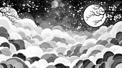 Wall mural a crescent moon surrounded by swirling clouds and stars in a night sky, creating a whimsical and dre - Wall murals Wall mural a crescent moon surrounded by swirling clouds and stars in a night sky, creating a whimsical and dre - Wall murals