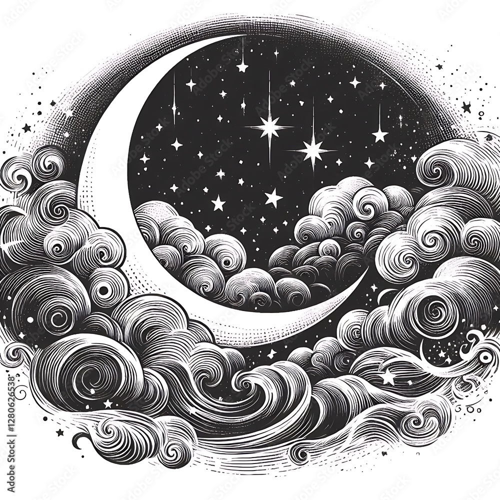 The watermark will not be included on Wall mural.: A crescent moon surrounded by swirling clouds and stars in a night sky, creating a whimsical and dre