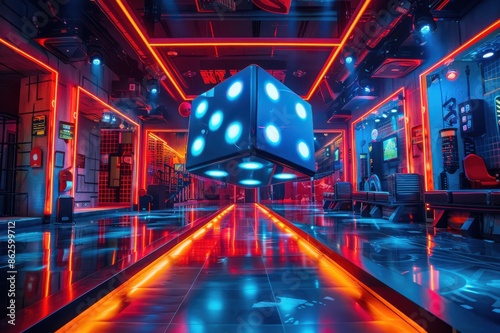 The watermark will not be included on Wall mural.: A cube is floating in the air in a futuristic setting