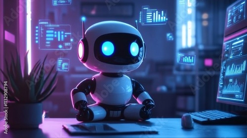 Wall mural : A cute robot sits at a desk with digital data displays in a futuristic setting -